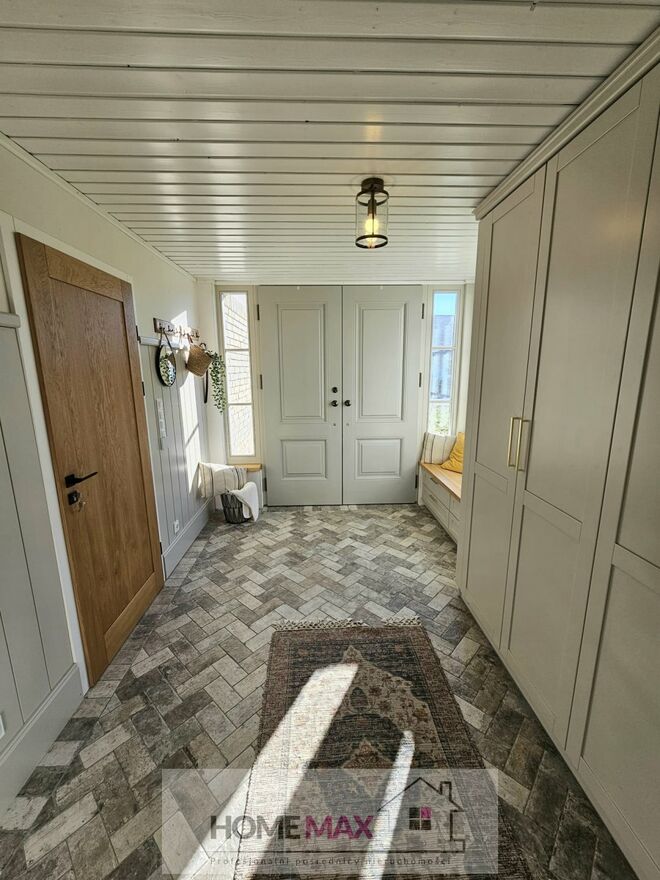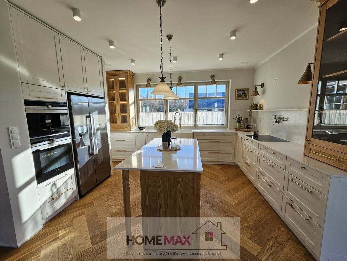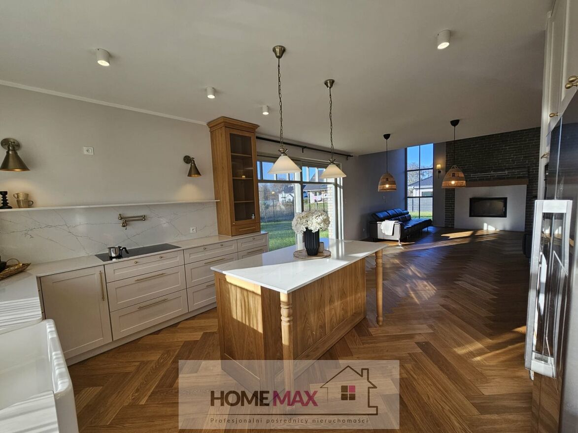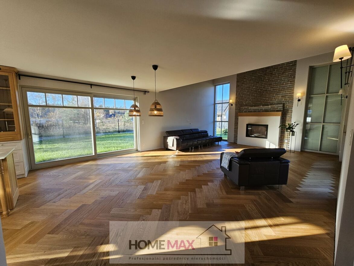 Wnętrze domu prezentuje najwyższy standard i utrzymanie jednej stylistyki wykończenia. Na podłodze położono deskę z drzewa dębowego szczotkowanego, drzwi wewnętrzne zaprojektowano z drewna dębowego fornirowanego. W kuchni fronty mebli wykończone są drewnem fornirowanym a blat zastosowano z konglomeratu. Zastosowane materiały są bardzo trwałe i łatwe w utrzymaniu czystości. Dom został zaprojektowany z duża dbałością o szczegóły i z zachowaniem jednej stylistyki wewnątrz i na zewnątrz co sprawiło, że idealnie wpasował się w krajobraz. W budynku zamontowano okna z drewna meranti z pakietem 3-szybowym i roletami elektrycznymi. Okna dachowe również posiadają rolety elektryczne. Dla wygody mieszkańców w domu zastosowano SmartDom Posiadłość jest idealna dla osób ceniących sobie ciszę i spokój a jednocześnie bliskość centrum miasta.