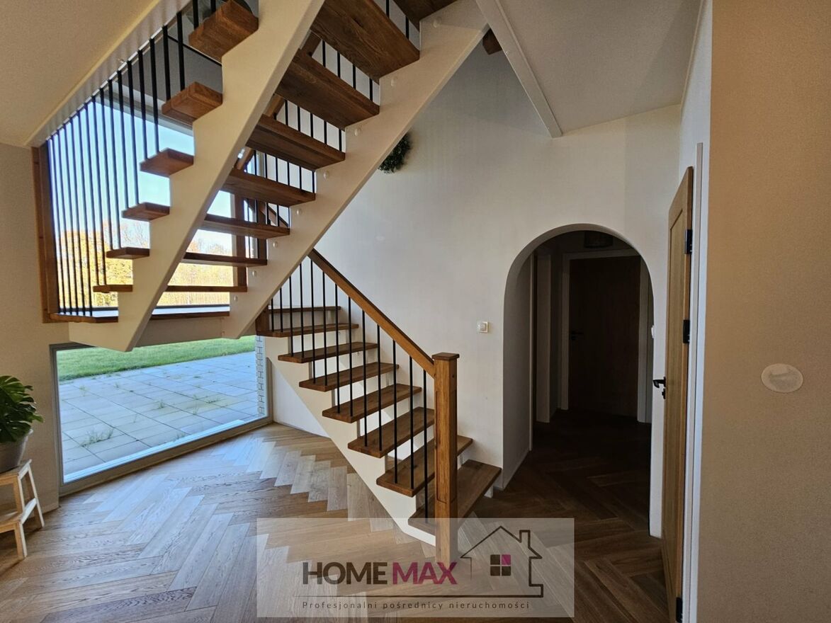 W holu znajduję się piękna, otwarta klatka schodowa z dużym oknem. Schody wykonane z drewna dębowego.